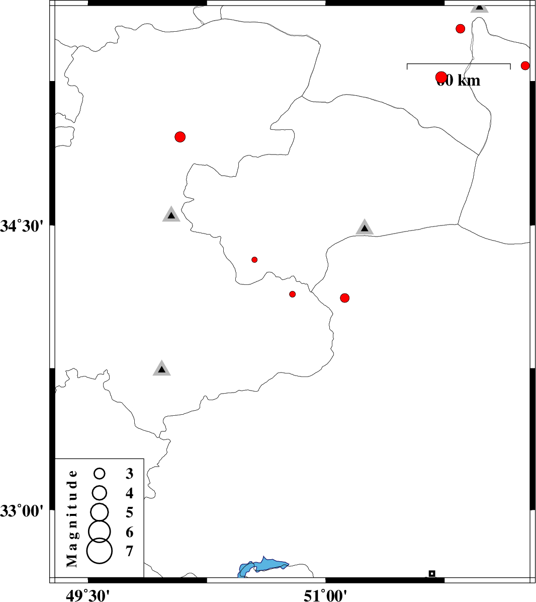| 2013/07/29 | 11:36:22.3 | 16:06:22.3 | 34.14 | 50.79 | 46 | ML:1.7 | Markazi Province, 20 km North-East of Delijan | ||