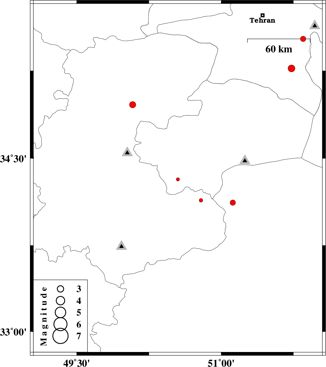 2013/07/22 | 18:11:55.5 | 22:41:55.5 | 34.96 | 50.08 | 14 | ML:2.9 | Markazi Province, 30 km North of Tafresh |