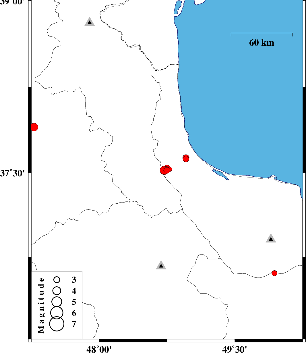 | 2013/07/31 | 10:02:00.3 | 14:32:00.3 | 37.52 | 48.75 | 29 | ML:3 | Gilan Province, 22 km South-East of Khalkhal | ||