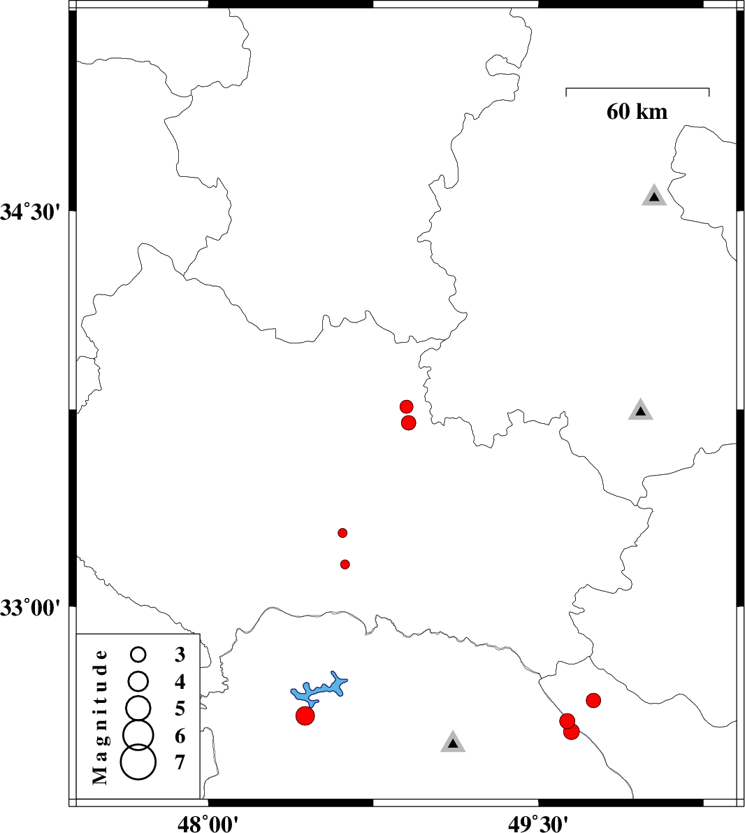 | 2013/08/03 | 05:06:00.6 | 09:36:00.6 | 33.76 | 48.9 | 7 | ML:2.7 | Lorestan Province, 20 km South-East of Borujerd | ||