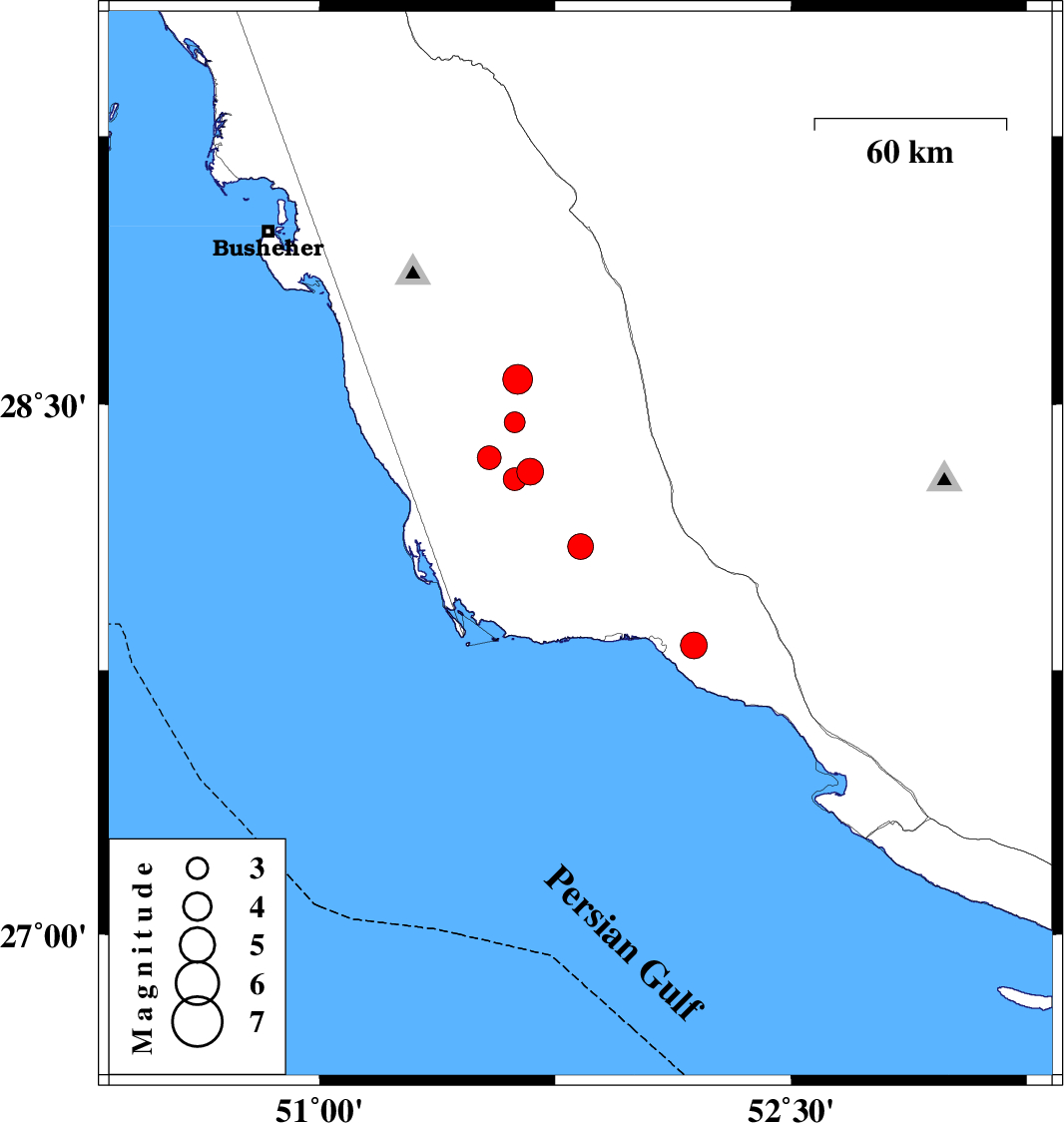 | 2013/08/03 | 13:21:36.6 | 17:51:36.6 | 27.82 | 52.19 | 35 | ML:3.8 | Bushehr Province, 13 km East of Bandar-e kangan | ||