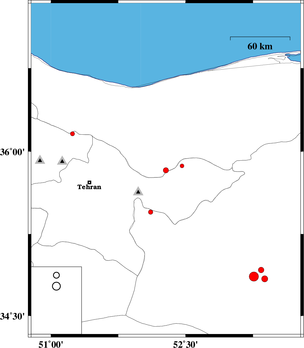 | 2013/08/04 | 02:51:44.1 | 07:21:44.1 | 35.45 | 52.11 | 19 | ML:2.2 | Semnan Province, 30 km South of Damavand | ||