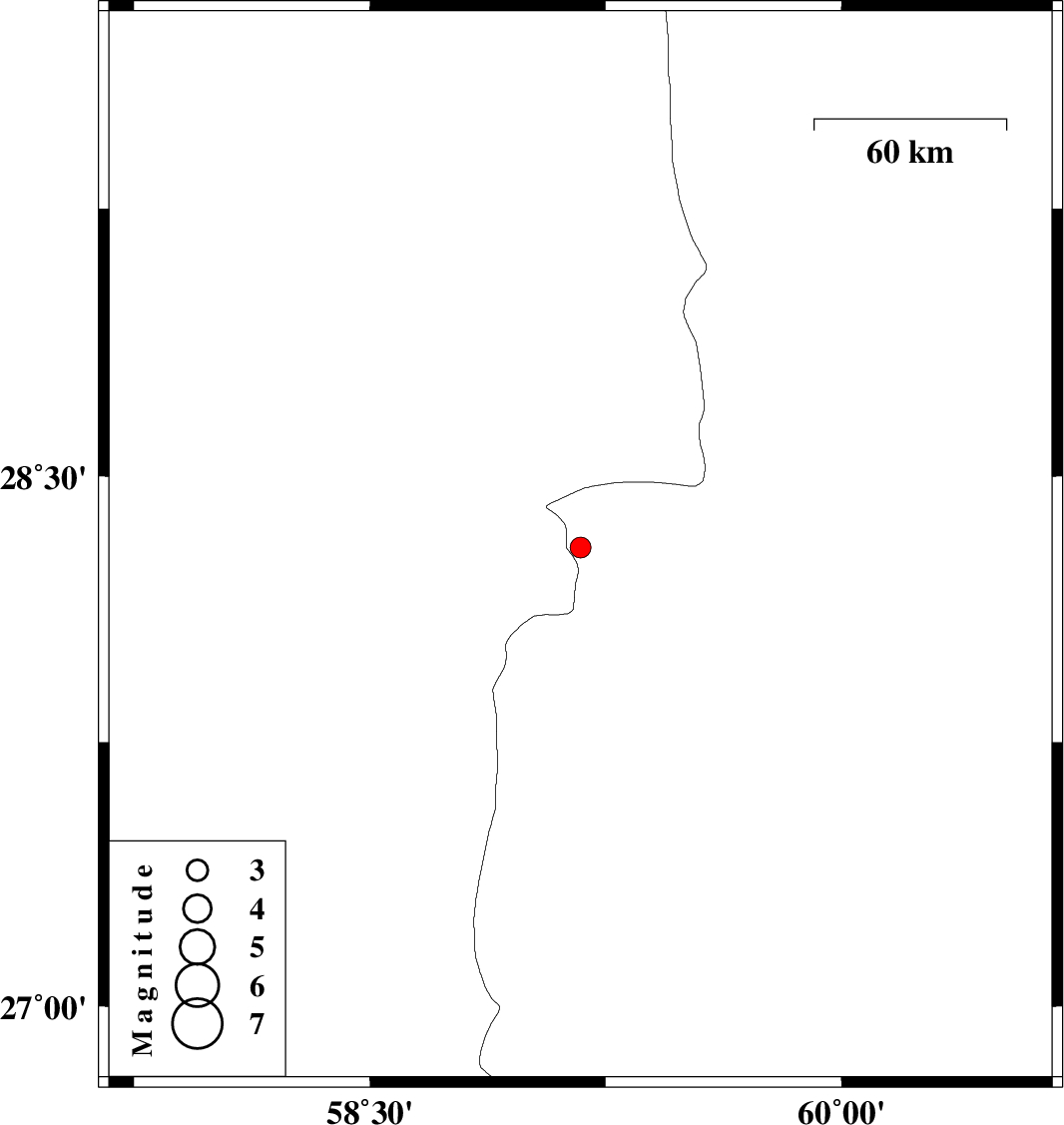 | 2013/08/08 | 16:26:41.3 | 20:56:41.3 | 28.3 | 59.17 | 14 | ML:3 | Sistan va Baloochestan Province, 119 km South-East of Bam | ||