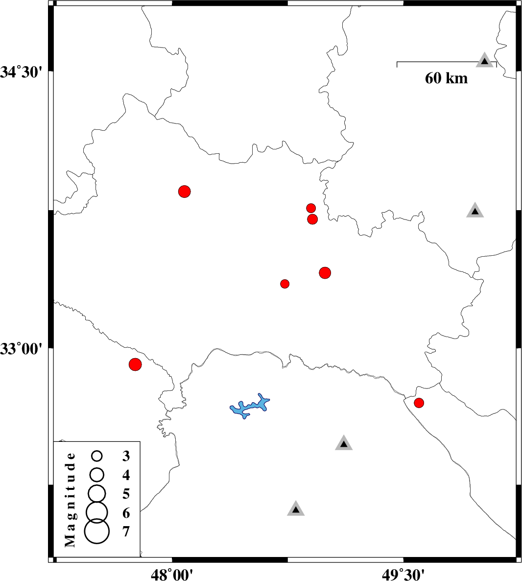 | 2013/08/03 | 05:06:00.6 | 09:36:00.6 | 33.76 | 48.9 | 7 | ML:2.7 | Lorestan Province, 20 km South-East of Borujerd | ||