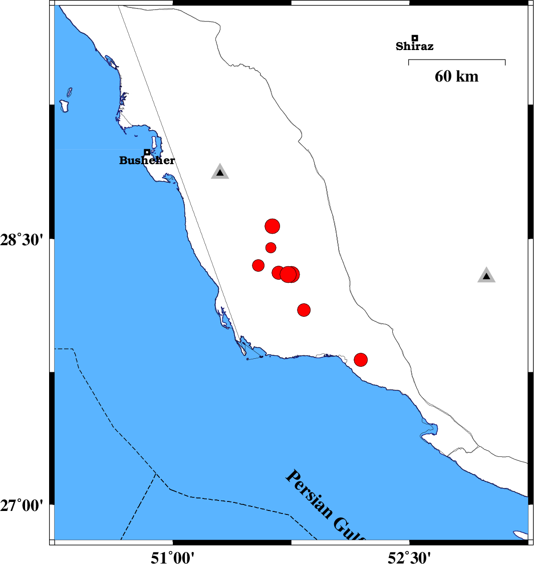 | 2013/08/03 | 13:21:36.6 | 17:51:36.6 | 27.82 | 52.19 | 35 | ML:3.8 | Bushehr Province, 13 km East of Bandar-e kangan | ||