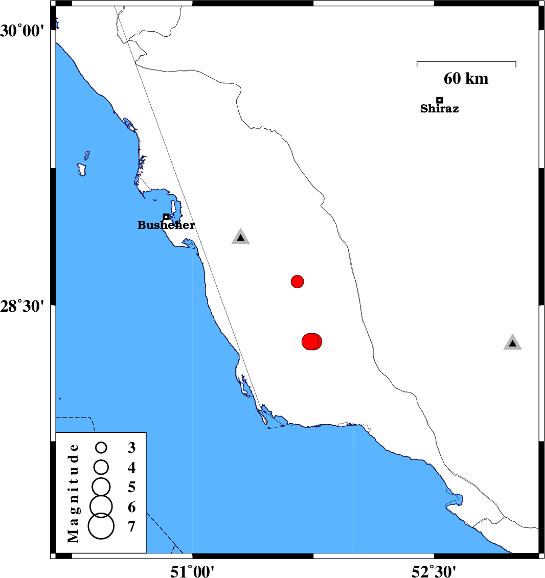 | 2013/08/14 | 04:06:24.0 | 08:36:24.0 | 28.63 | 51.65 | 16 | ML:3.5 | Bushehr Province, 27 km East of Khormog | ||