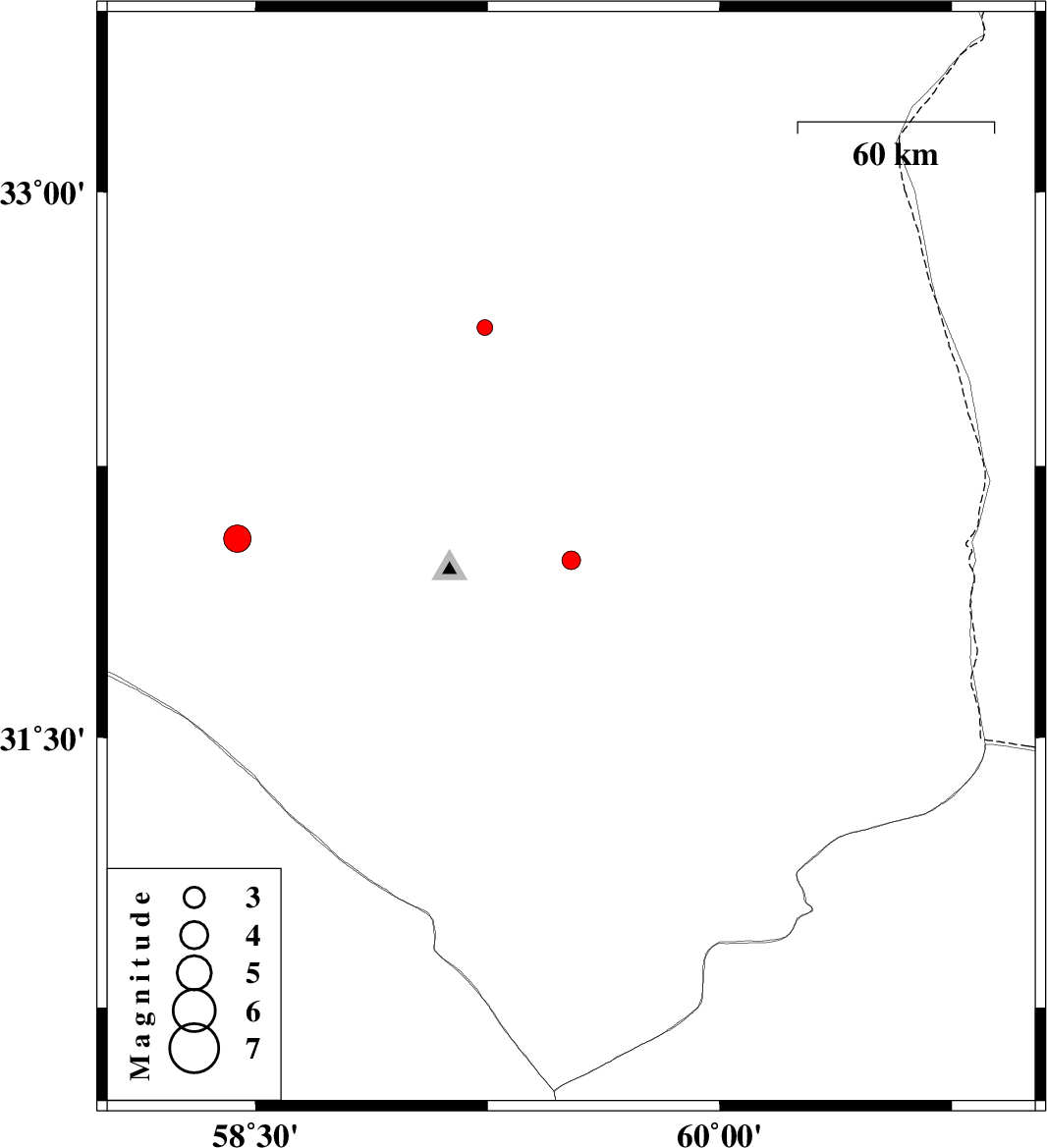 | 2013/07/28 | 12:46:44.6 | 17:16:44.6 | 32.05 | 58.44 | 18 | ML:3.9 | Khorasan(south) Province, 120 km South-West of Birjand | ||