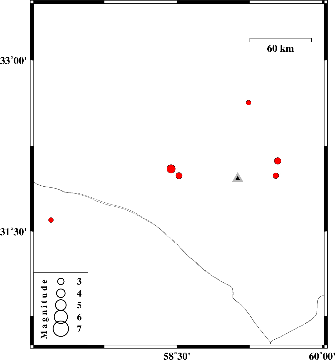 | 2013/08/16 | 15:42:50.6 | 20:12:50.6 | 31.99 | 58.52 | 14 | ML:3 | Khorasan(south) Province, 121 km South-West of Birjand | ||