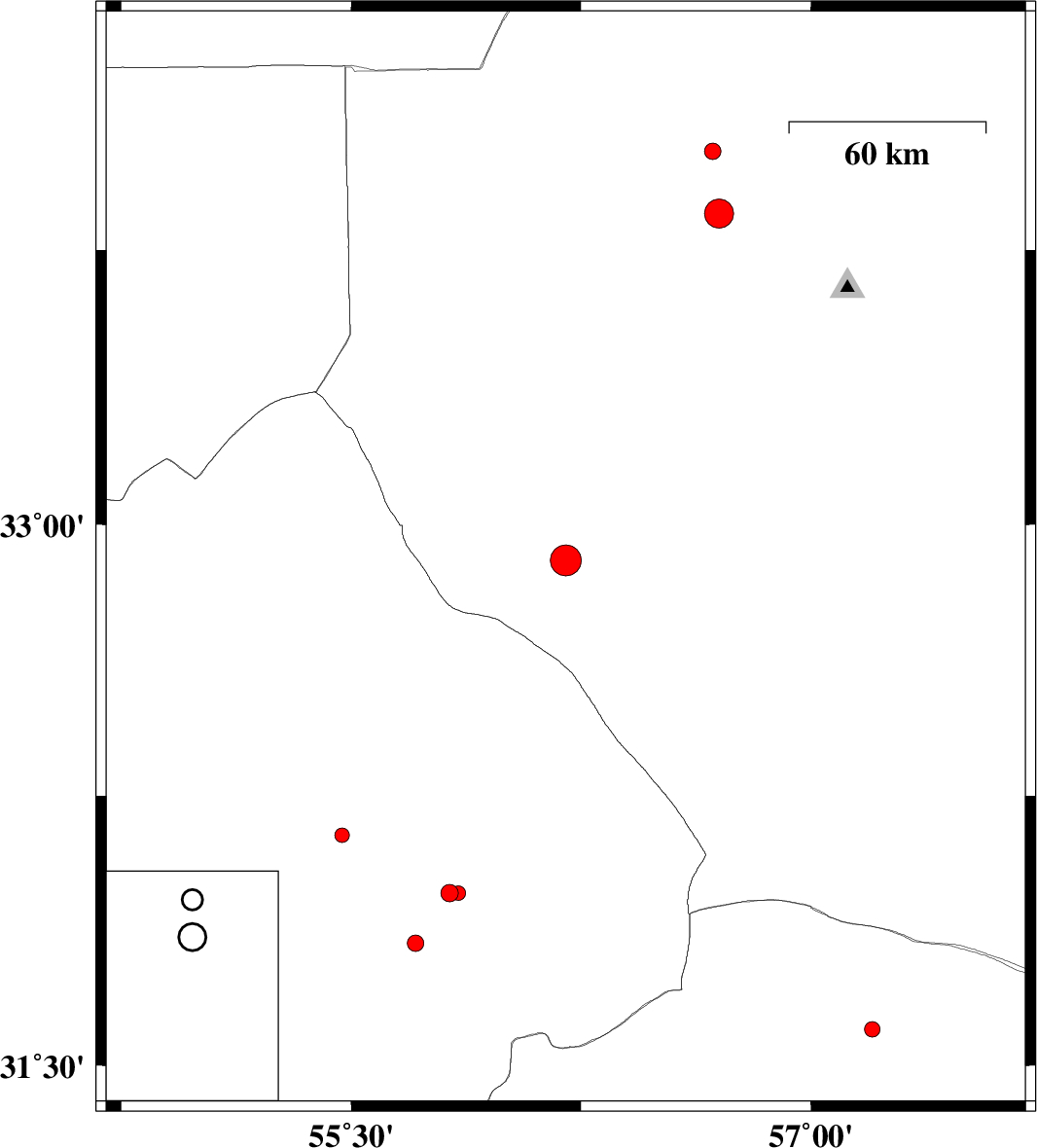 | 2013/07/26 | 11:40:32.1 | 16:10:32.1 | 32.14 | 55.47 | 14 | ML:2.1 | Yazd Province, 60 km North of Bafq | ||