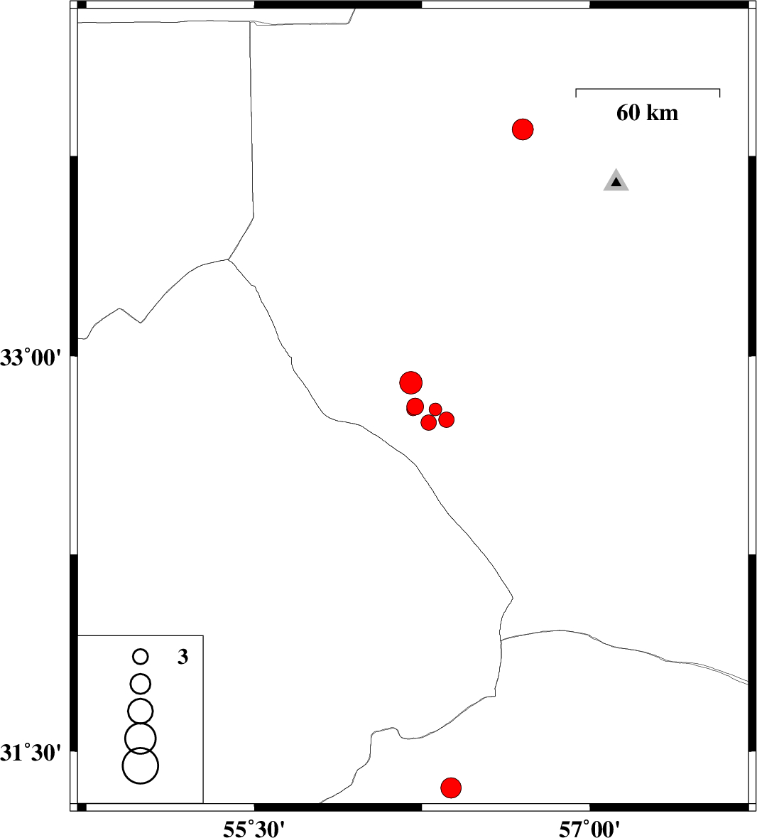 | 2013/08/17 | 01:33:44.1 | 06:03:44.1 | 32.8 | 56.21 | 6 | ML:2.5 | Yazd Province, 111 km South-West of Tabas | ||