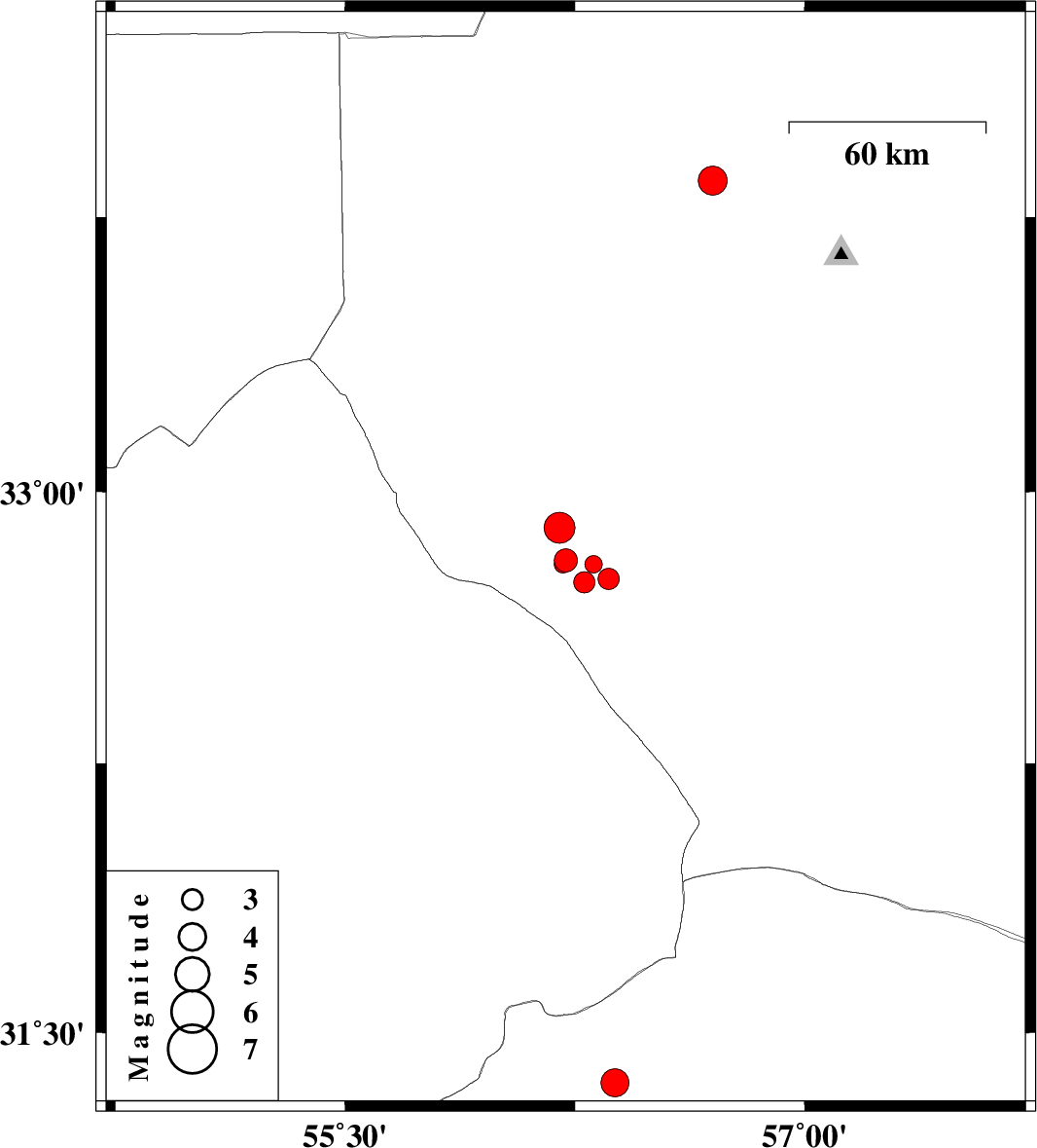 | 2013/08/17 | 01:33:44.1 | 06:03:44.1 | 32.8 | 56.21 | 6 | ML:2.5 | Yazd Province, 111 km South-West of Tabas | ||
