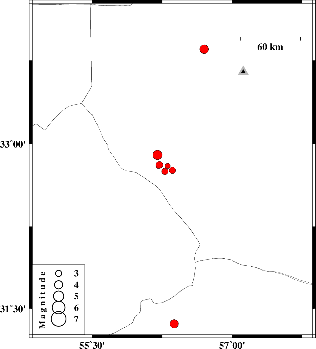 | 2013/08/17 | 01:33:44.1 | 06:03:44.1 | 32.8 | 56.21 | 6 | ML:2.5 | Yazd Province, 111 km South-West of Tabas | ||