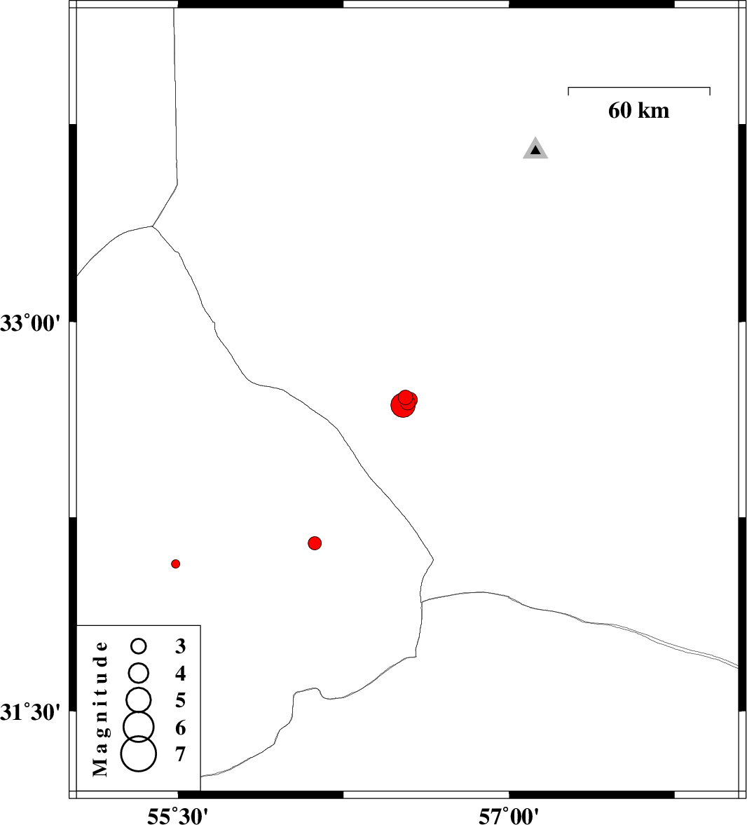 | 2013/08/28 | 02:03:44.1 | 06:33:44.1 | 32.69 | 56.54 | 15 | ML:2.9 | Yazd Province, 108 km South-West of Tabas | ||