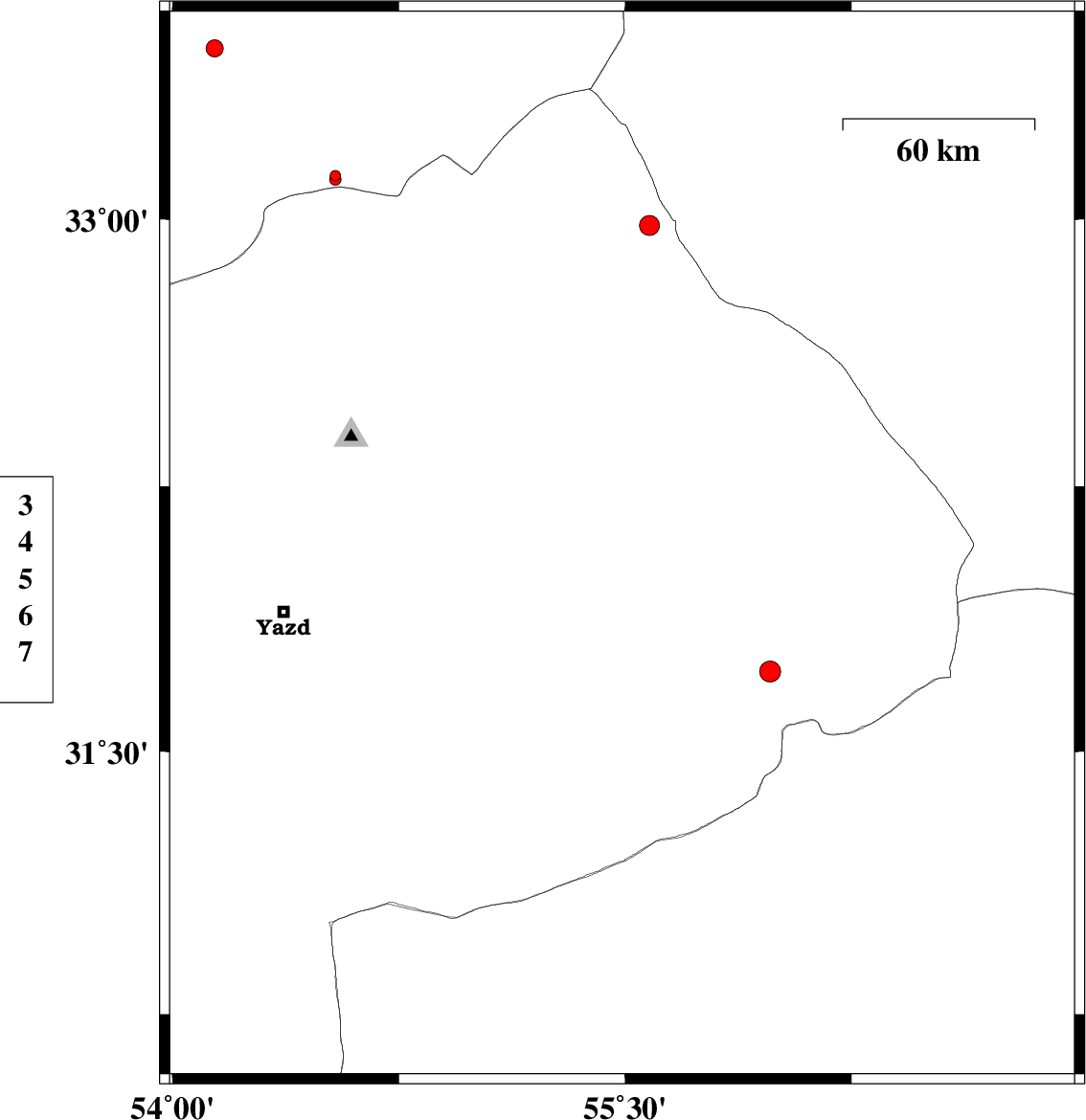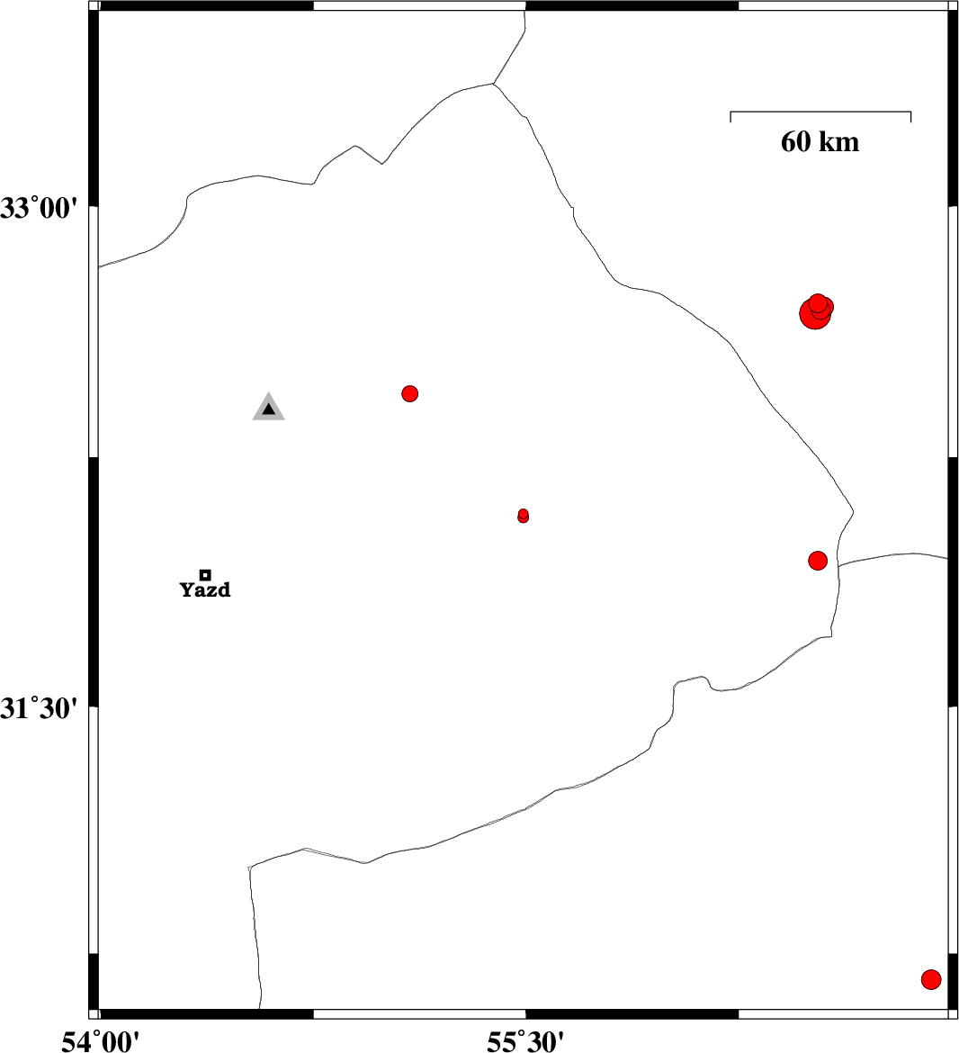 | 2013/08/26 | 13:28:32.7 | 17:58:32.7 | 32.07 | 55.49 | 14 | ML:1.7 | Yazd Province, 53 km North of Bafq |