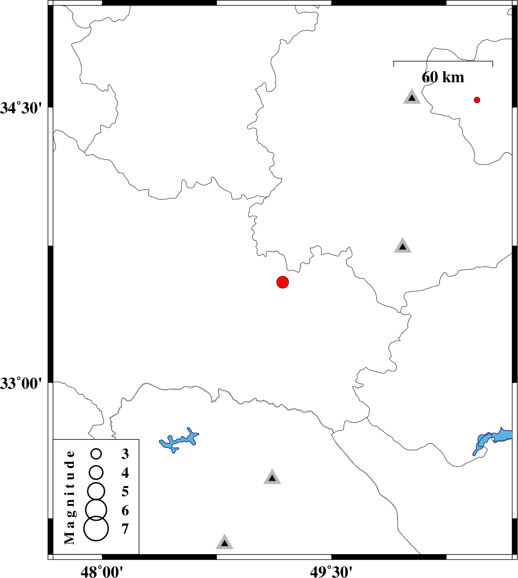 | 2013/09/03 | 20:04:58.5 | 00:34:58.5 | 33.55 | 49.18 | 14 | ML:3.5 | Lorestan Province, 12 km East of Dorud | ||