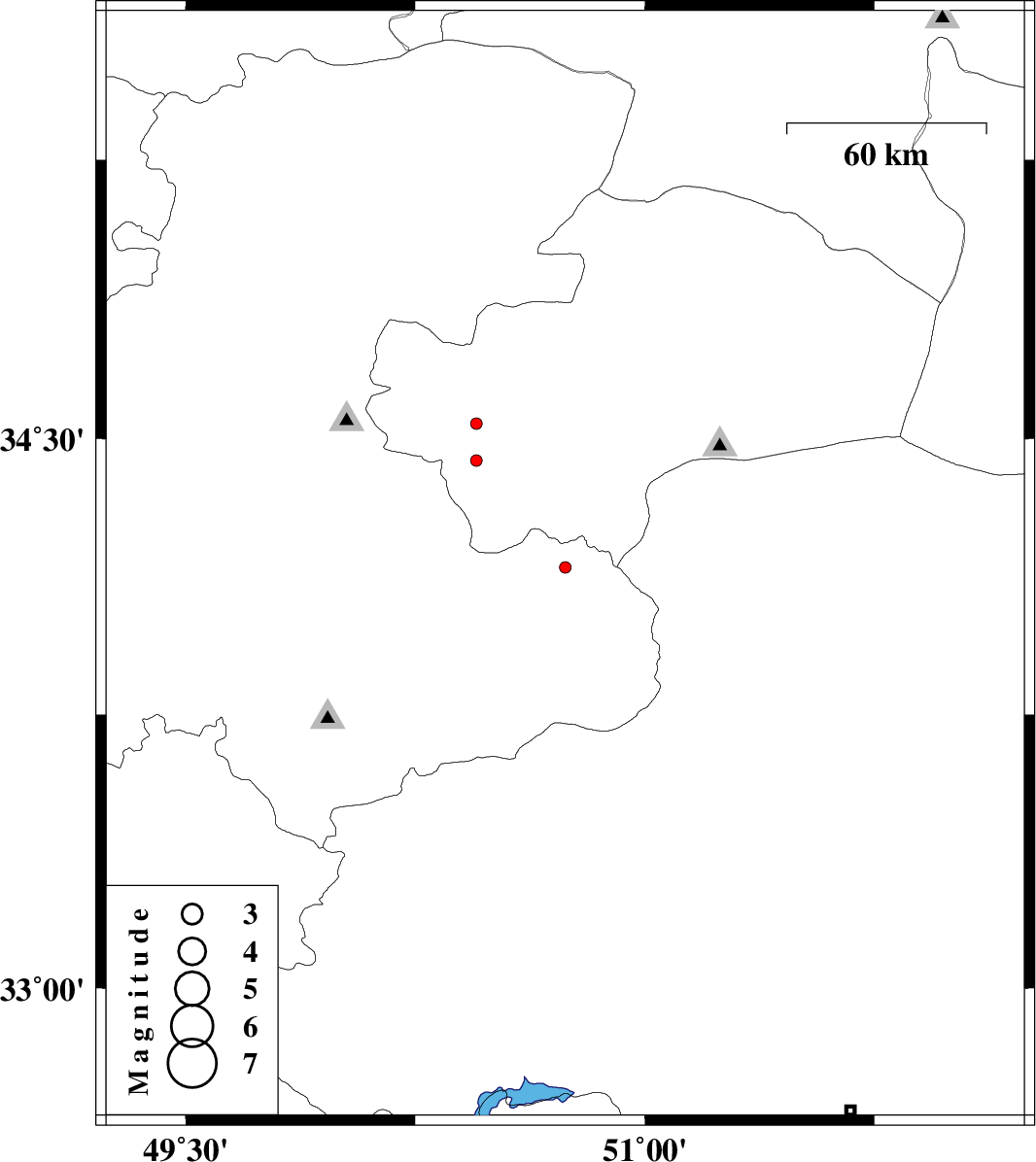 | 2013/09/03 | 15:15:45.2 | 19:45:45.2 | 34.54 | 50.45 | 14 | ML:1.7 | Qom Province, 41 km East of Ashtiyan |