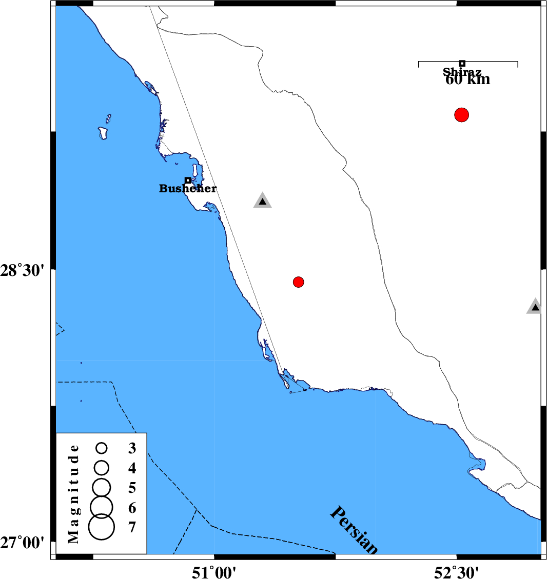 | 2013/09/05 | 22:09:08.4 | 02:39:08.4 | 28.43 | 51.52 | 38 | ML:2.9 | Bushehr Province, 29 km South-East of Khormog | ||