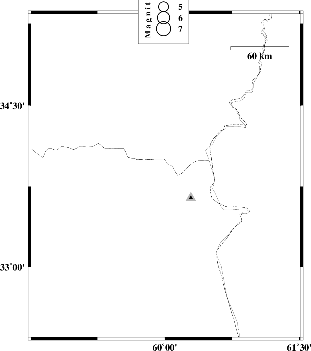 | 2013/08/27 | 19:07:09.4 | 23:37:09.4 | 33.02 | 60.41 | 26 | ML:3.9 | Khorasan(south) Province, 73 km North-East of Sarbisheh |