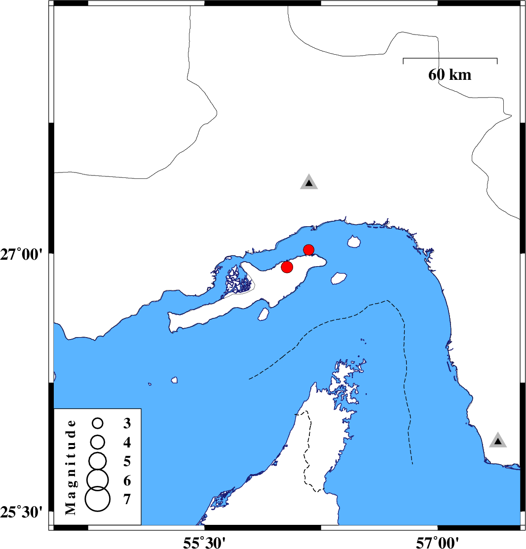 | 2013/09/17 | 16:19:41.3 | 20:49:41.3 | 26.92 | 56.03 | 15 | ML:3.4 | Persian Gulf, 24 km West of Qeshm |