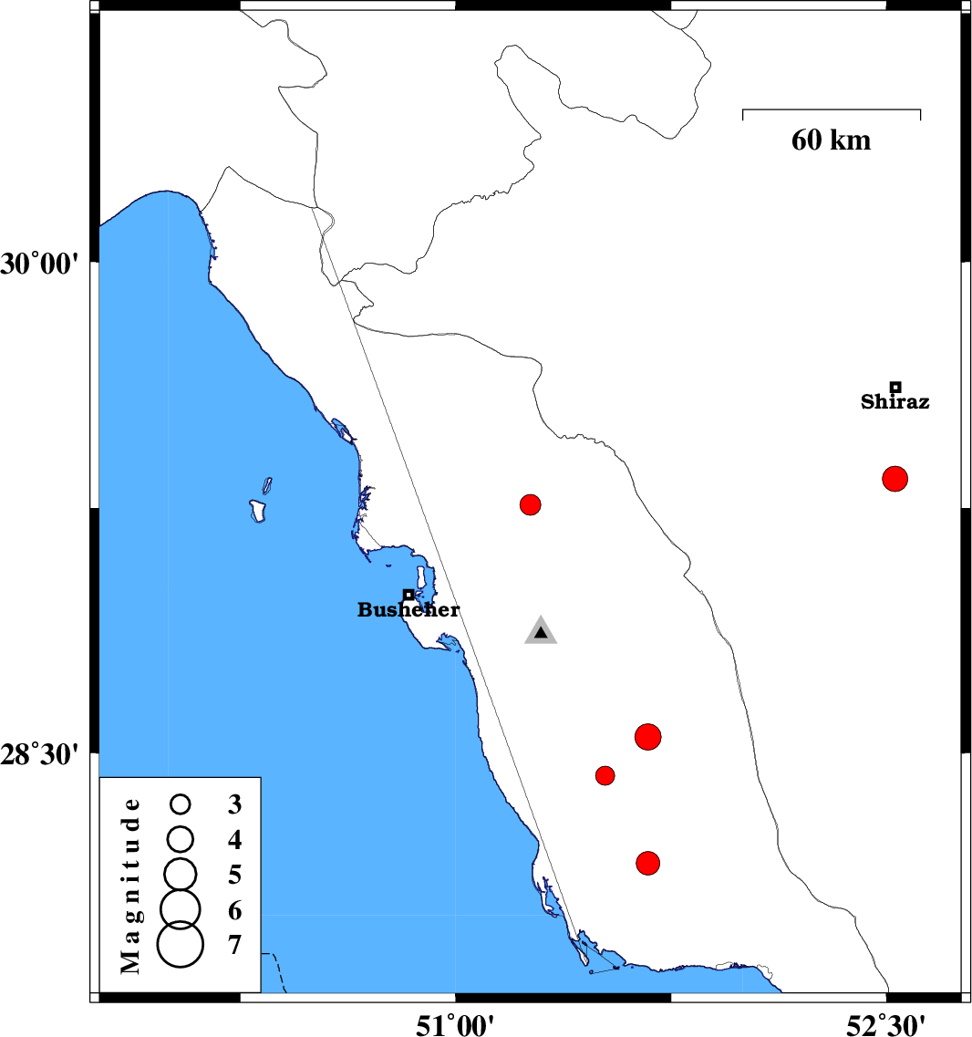 | 2013/09/05 | 22:09:08.4 | 02:39:08.4 | 28.43 | 51.52 | 38 | ML:2.9 | Bushehr Province, 29 km South-East of Khormog | ||
