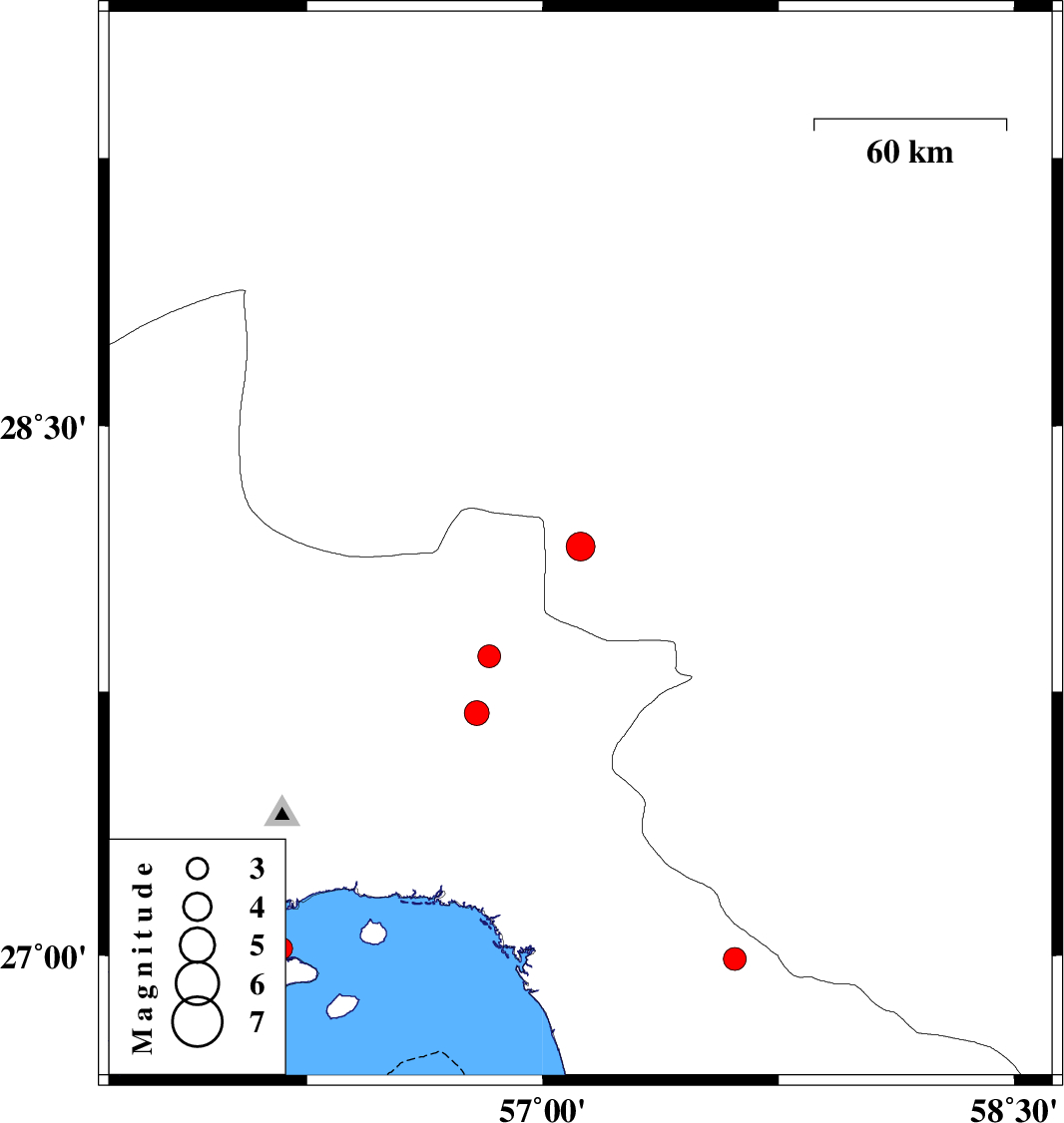 | 2013/09/05 | 02:59:06.9 | 07:29:06.9 | 27.85 | 56.83 | 14 | ML:3.3 | Hormozgan Province, 62 km North-West of Dehbarez | ||