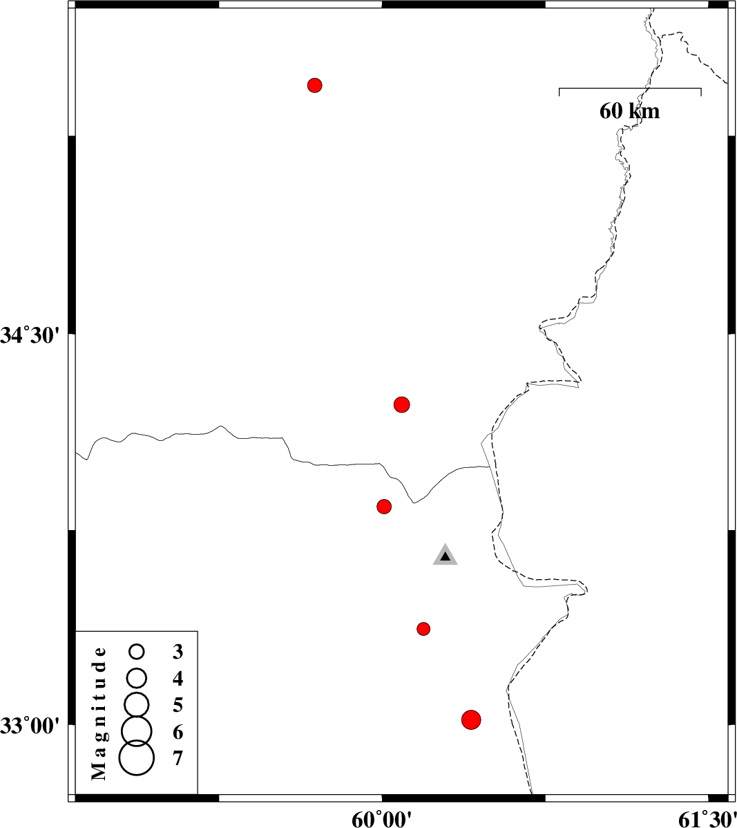 | 2013/08/31 | 15:24:20.9 | 19:54:20.9 | 33.37 | 60.19 | 14 | ML:2.7 | Khorasan(south) Province, 91 km North-East of Sarbisheh | ||