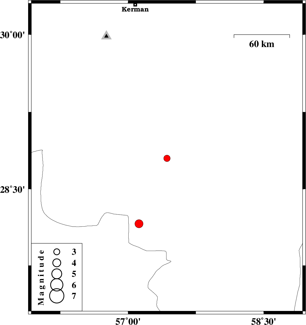 | 2013/09/21 | 06:27:33.9 | 10:57:33.9 | 28.16 | 57.12 | 14 | ML:4.1 | Kerman Province, 61 km North-West of Kahnuj |