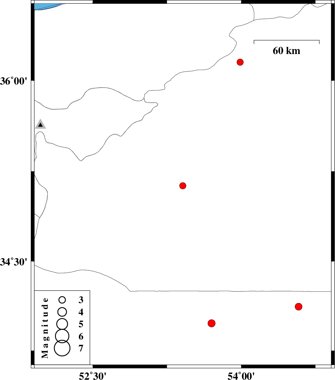 2013/09/19 | 07:15:23.8 | 11:45:23.8 | 36.15 | 53.99 | 14 | ML:2.9 | Semnan Province, 32 km West of Damghan |
