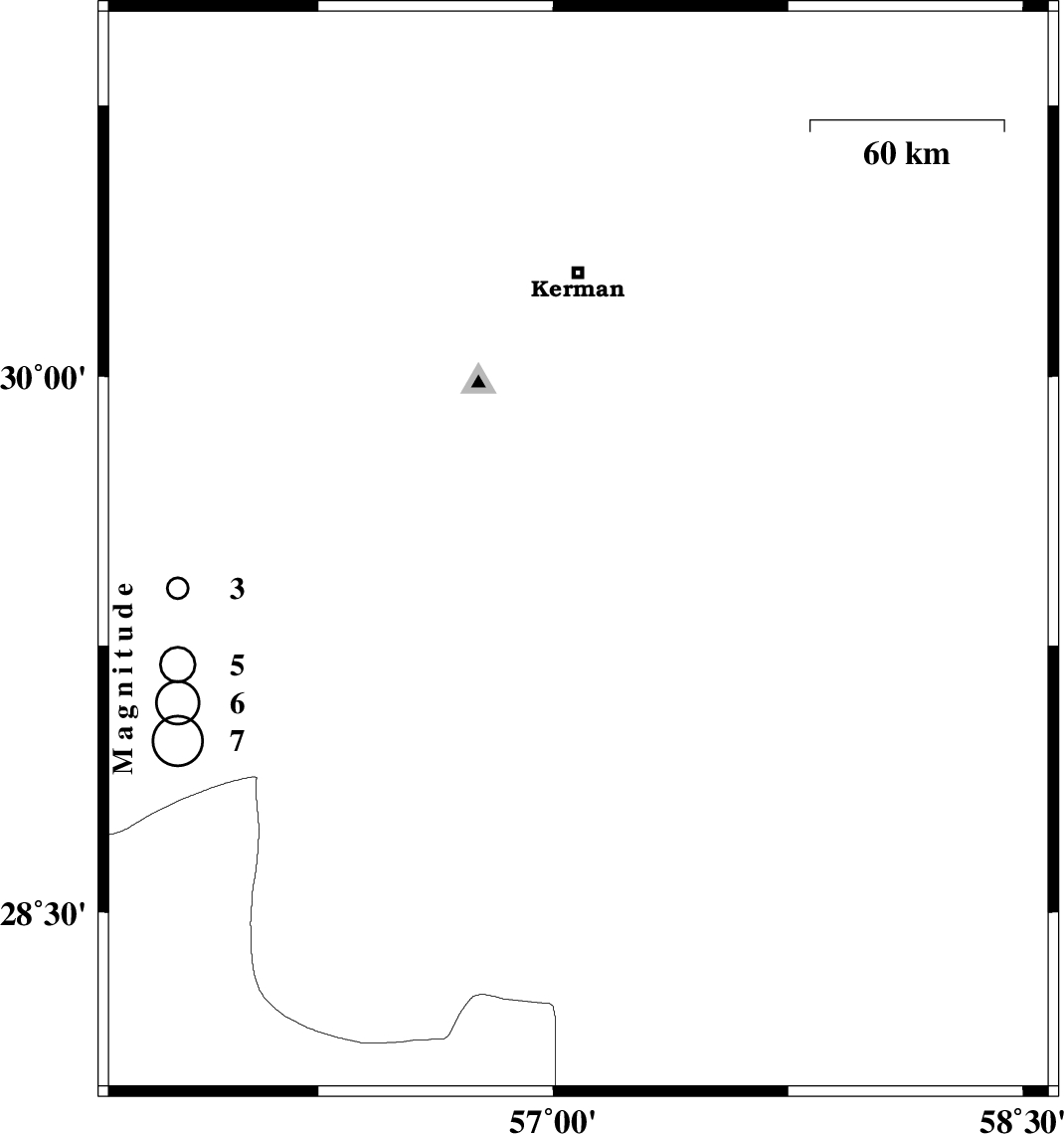 2013/09/24 | 16:12:32.7 | 19:42:32.7 | 30.74 | 57.18 | 15 | ML:2.8 | Kerman Province, 51 km North-East of Kerman | ||