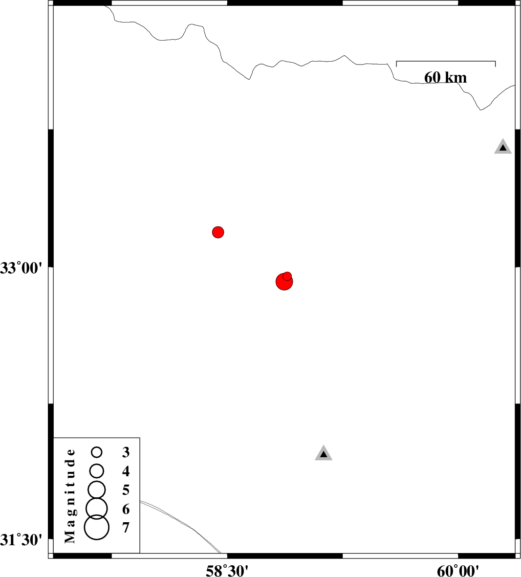 | 2013/10/04 | 18:17:27.1 | 21:47:27.1 | 32.92 | 58.87 | 15 | ML:4.9 | Khorasan(south) Province, 34 km West of Birjand | ||