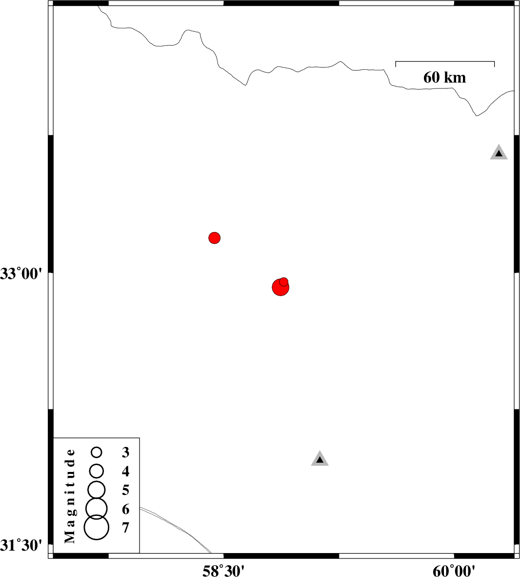 | 2013/10/04 | 18:17:27.1 | 21:47:27.1 | 32.92 | 58.87 | 15 | ML:4.9 | Khorasan(south) Province, 34 km West of Birjand | ||