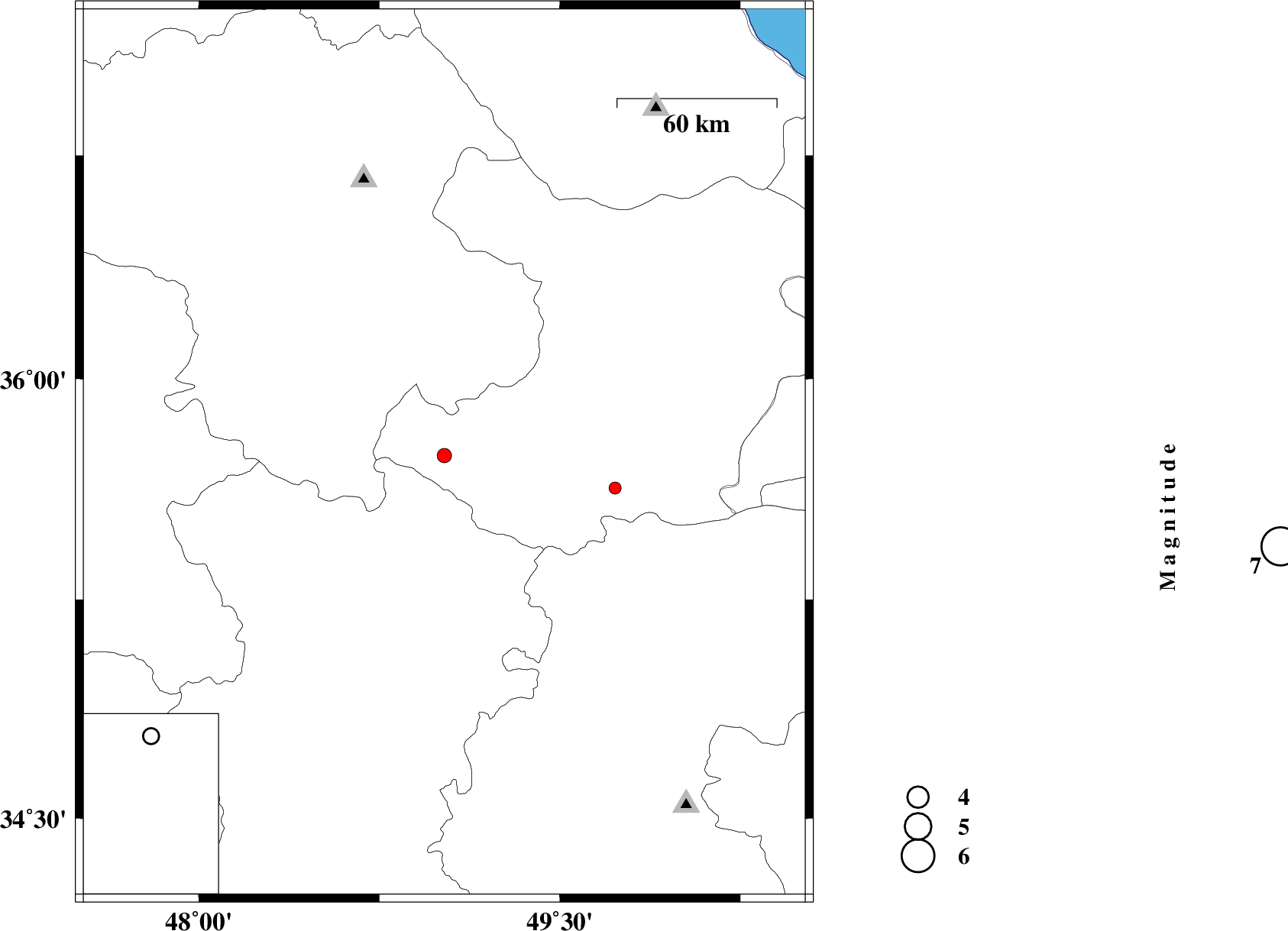 2013/10/04 | 15:28:06.4 | 18:58:06.4 | 35.63 | 49.73 | 16 | ML:2.3 | Ghazvin Province, 48 km South of Takestan |