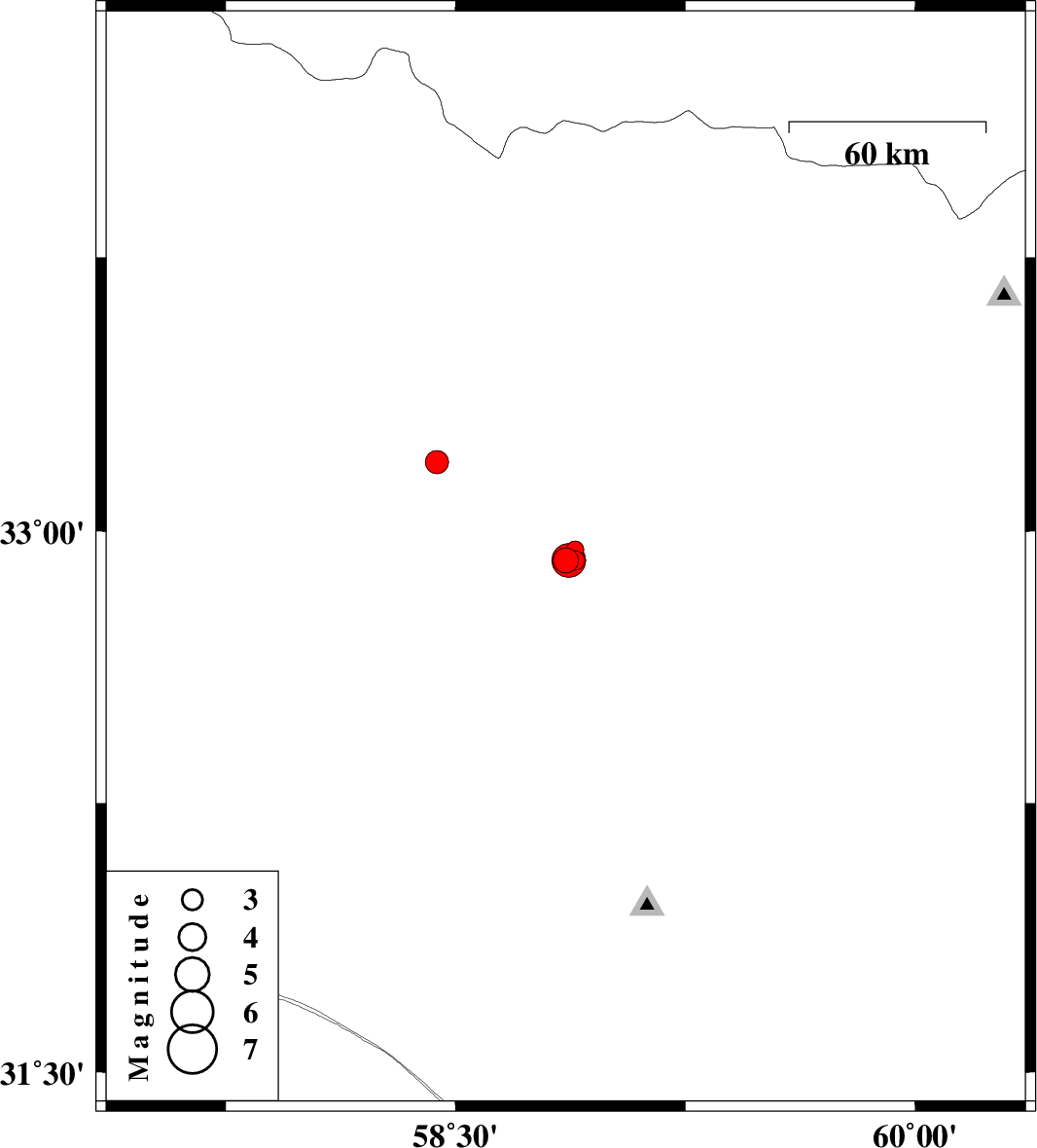 | 2013/10/05 | 15:56:27.1 | 19:26:27.1 | 32.92 | 58.85 | 14 | ML:2.9 | Khorasan(south) Province, 35 km West of Birjand | ||