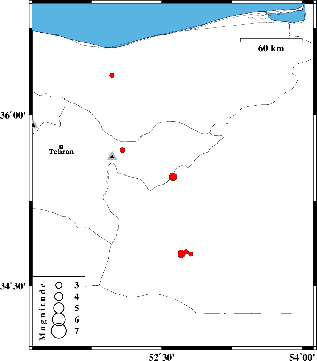 2013/10/09 | 02:07:17.2 | 05:37:17.2 | 35.46 | 52.62 | 14 | ML:3.8 | Semnan Province, 35 km South-West of Firuzkuh | ||