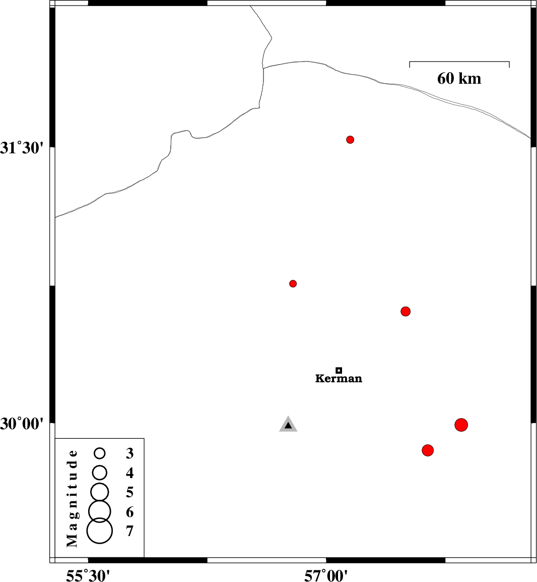 | 2013/10/12 | 00:33:48.1 | 04:03:48.1 | 29.85 | 57.64 | 30 | ML:3.3 | Kerman Province, 73 km South-East of Kerman | ||