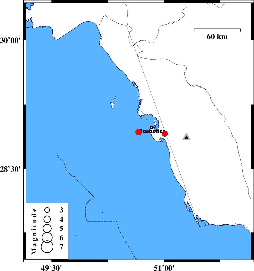2013/10/22 | 11:09:40.7 | 14:39:40.7 | 28.93 | 50.66 | 18 | ML:3.6 | Persian Gulf, 18 km West of Busheher | ||