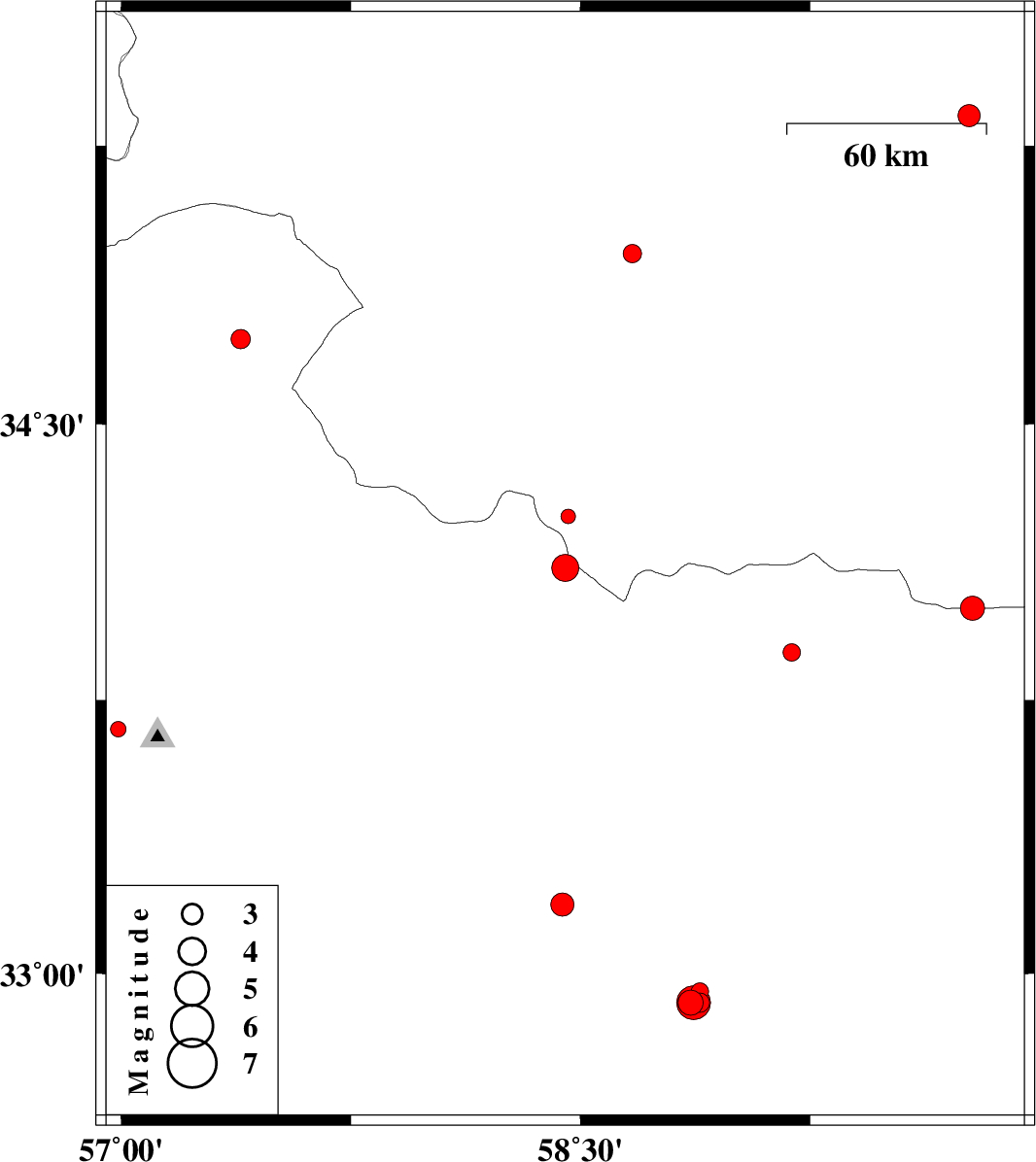 2013/10/05 15:56:27.1 19:26:27.1 32.9258.8514 ML:2.9 Khorasan(south) Province, 35 km West of Birjand