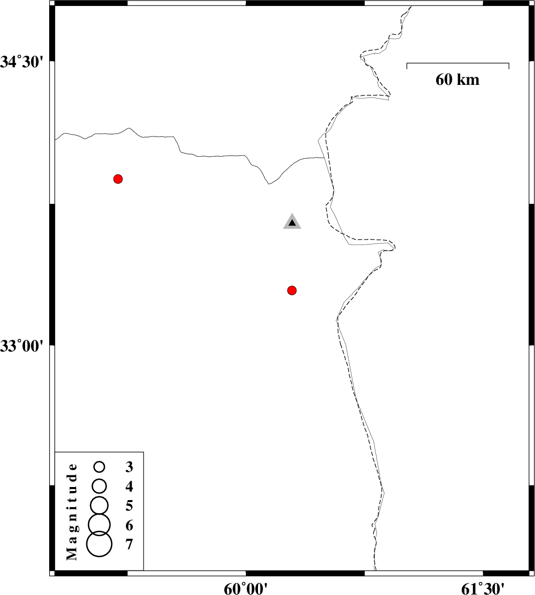 | 2013/10/26 | 09:11:50.9 | 12:41:50.9 | 33.88 | 59.19 | 35 | ML:2.5 | 16 km North of Qaen |