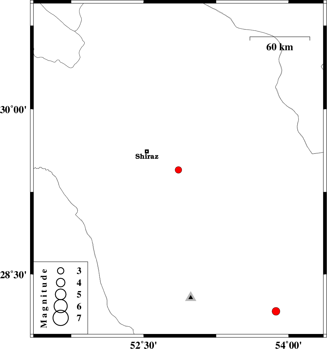 | 2013/10/07 | 02:40:08.9 | 06:10:08.9 | 28.16 | 53.87 | 46 | ML:3.7 | Fars Province, 49 km South-East of Jahrom |