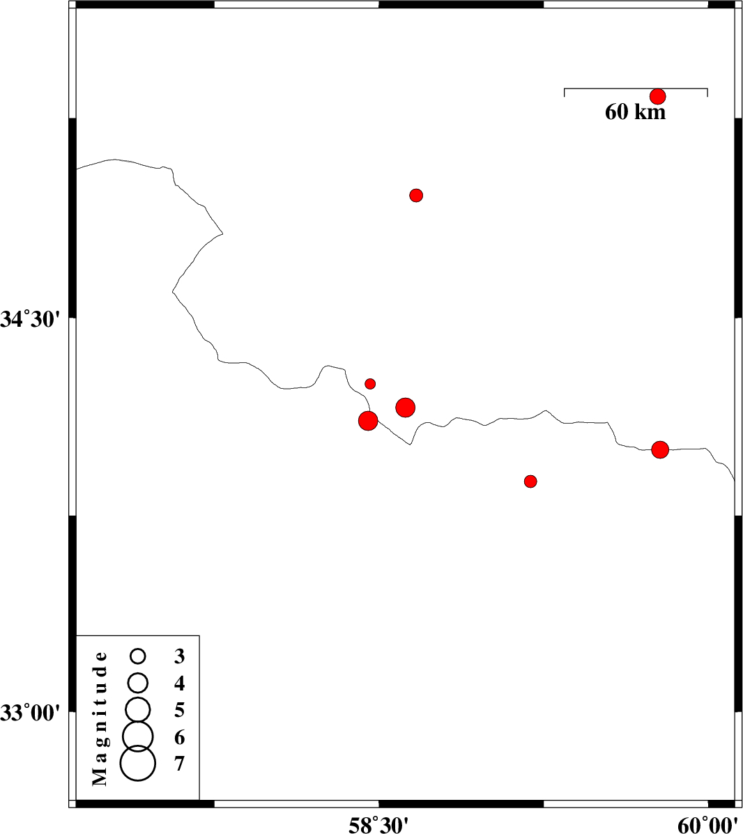 2013/10/26 | 09:11:50.9 | 12:41:50.9 | 33.88 | 59.19 | 35 | ML:2.5 | 16 km North of Qaen | ||
