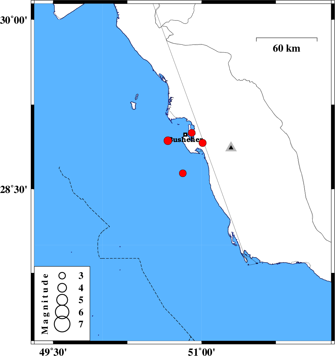 2013/11/08 | 21:14:14.0 | 00:44:14.0 | 28.64 | 50.81 | 15 | ML:3.2 | Persian Gulf, 39 km South of Busheher | ||