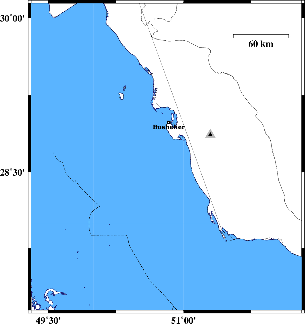 2013/10/22 | 11:09:40.7 | 14:39:40.7 | 28.93 | 50.66 | 18 | ML:3.6 | Persian Gulf, 18 km West of Busheher | ||