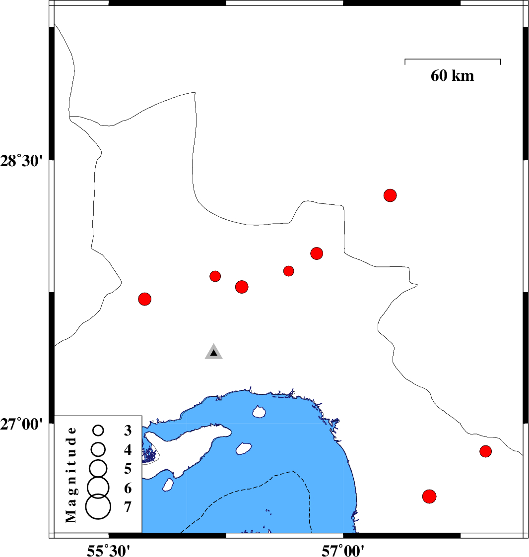 2013/11/07 | 23:38:53.1 | 03:08:53.1 | 26.58 | 57.55 | 42 | ML:3.9 | Hormozgan Province, 92 km South of Manujan | ||