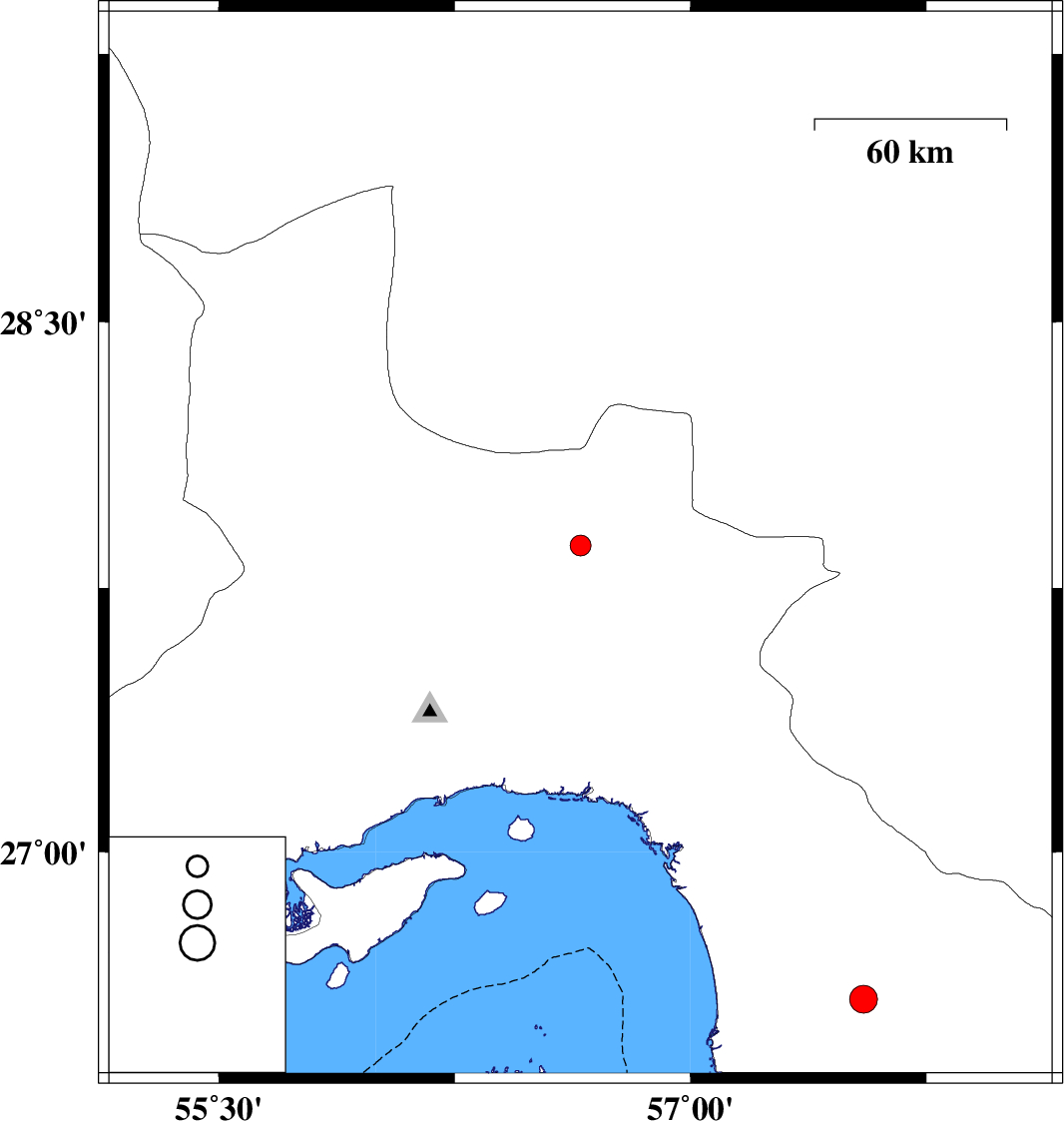 2013/11/07 | 23:38:53.1 | 03:08:53.1 | 26.58 | 57.55 | 42 | ML:3.9 | Hormozgan Province, 92 km South of Manujan |