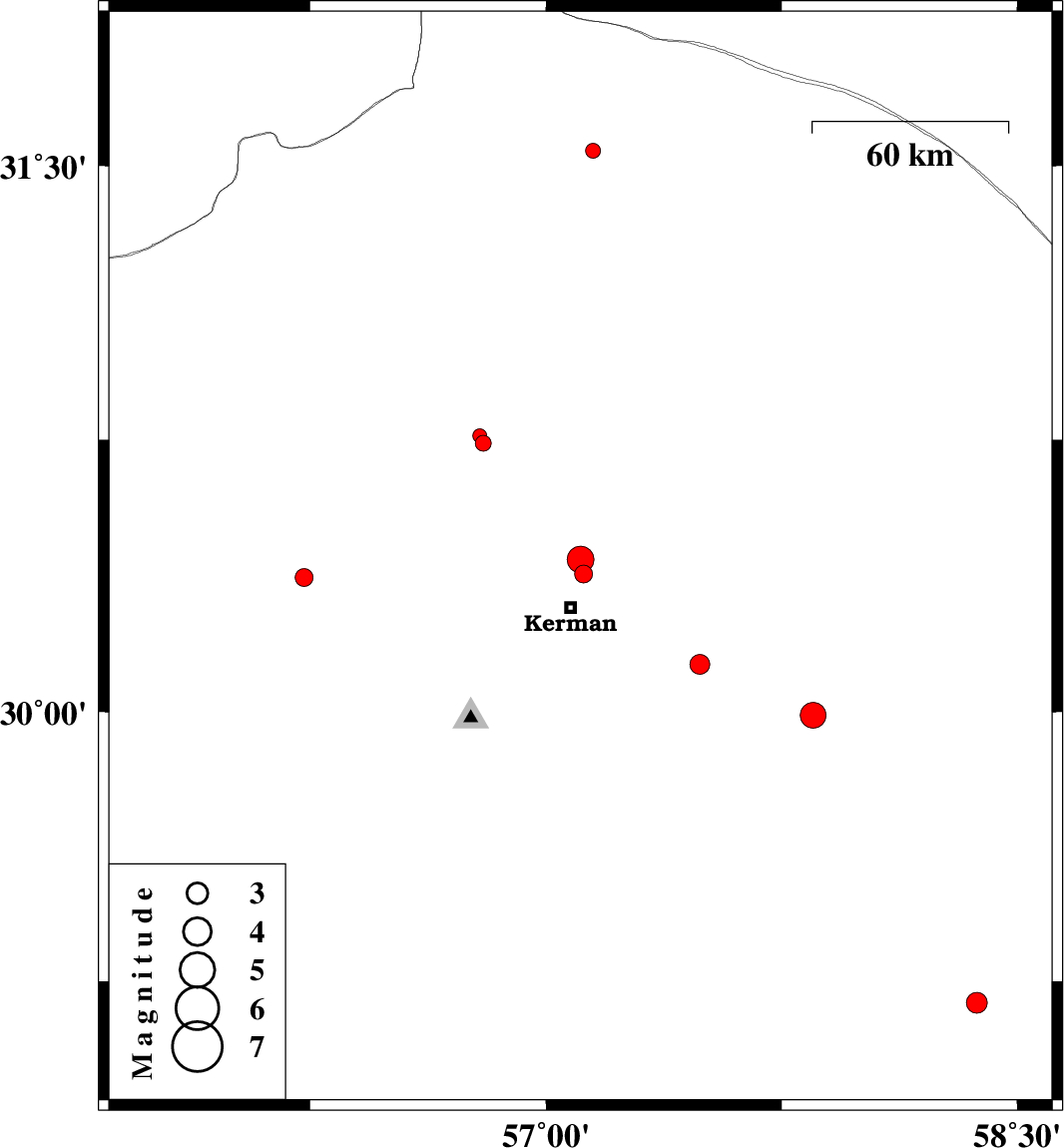 | 2013/11/12 | 02:27:23.4 | 05:57:23.4 | 30.42 | 57.11 | 14 | ML:3.8 | Kerman Province, 15 km North of Kerman | ||