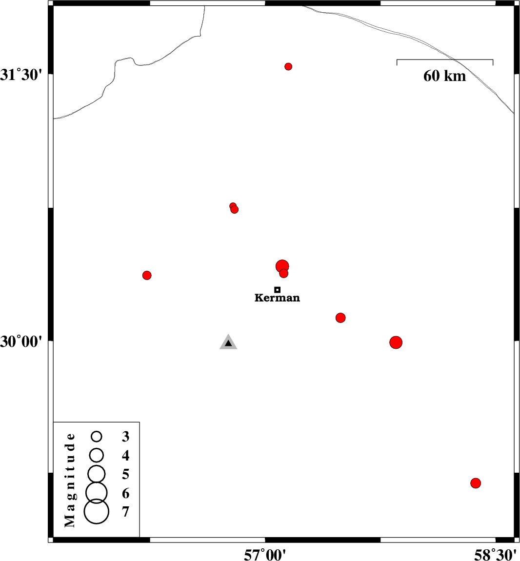 | 2013/11/12 | 02:27:23.4 | 05:57:23.4 | 30.42 | 57.11 | 14 | ML:3.8 | Kerman Province, 15 km North of Kerman | ||