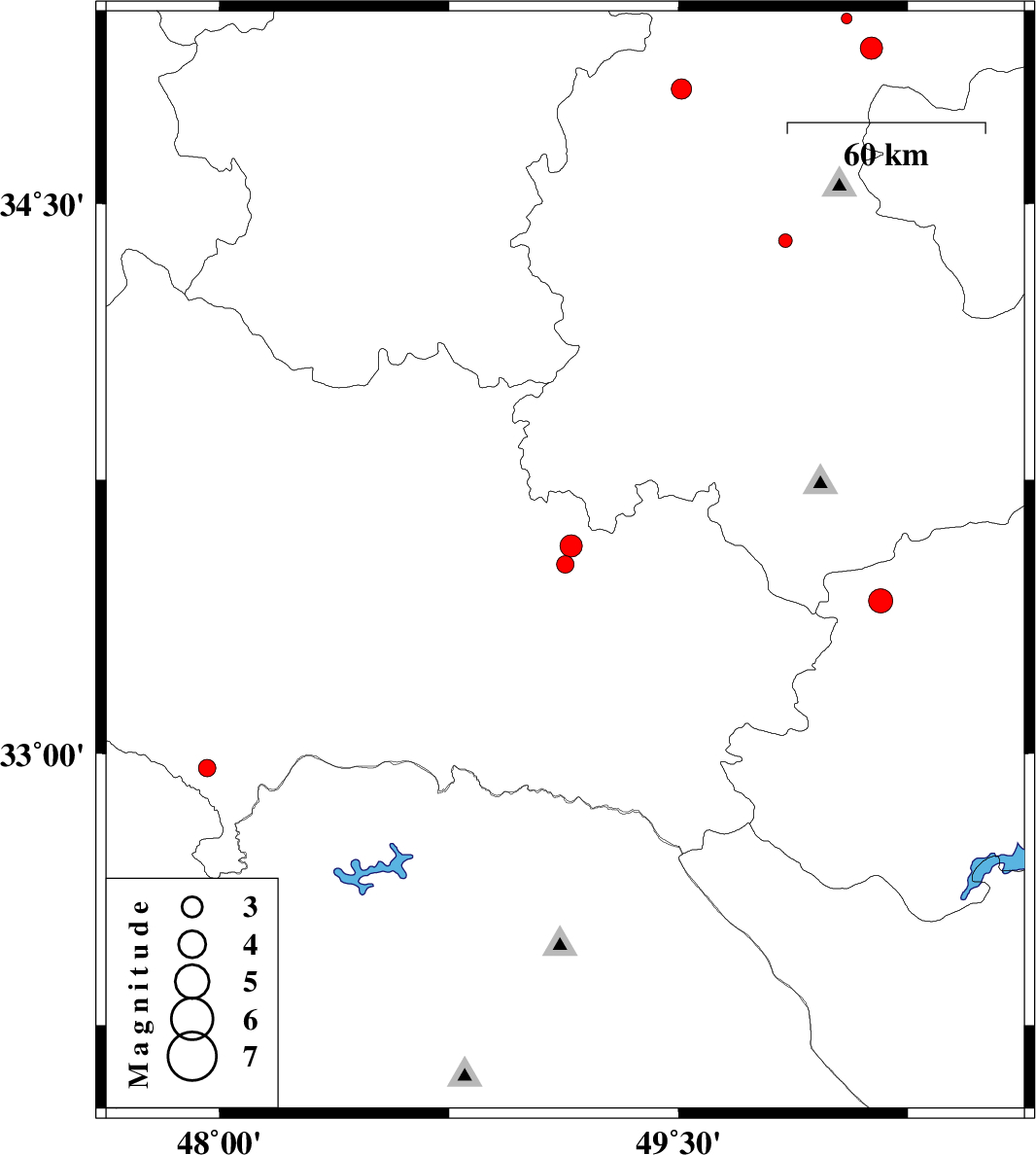 2013/11/12 | 09:50:14.7 | 13:20:14.7 | 33.52 | 49.13 | 6 | ML:2.5 | Lorestan Province, 6 km Dorud | ||