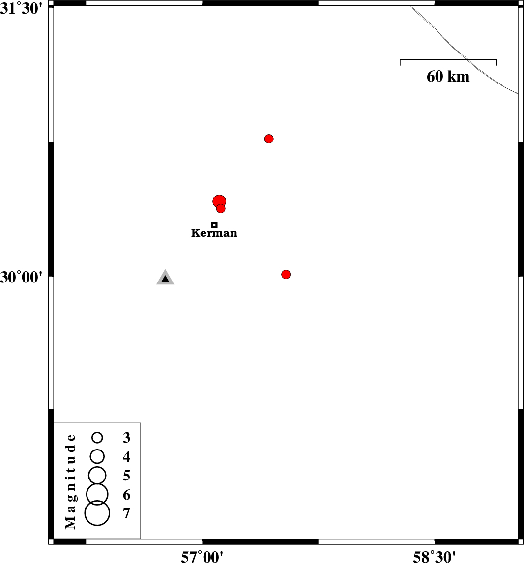 2013/11/12 | 02:27:23.4 | 05:57:23.4 | 30.42 | 57.11 | 14 | ML:3.8 | Kerman Province, 15 km North of Kerman |