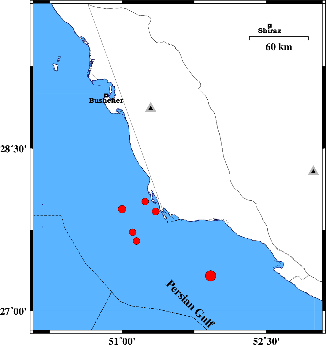 2013/10/27 | 09:26:32.5 | 12:56:32.5 | 29 | 50.9 | 24 | ML:3.3 | Persian Gulf, 6 km Busheher | ||