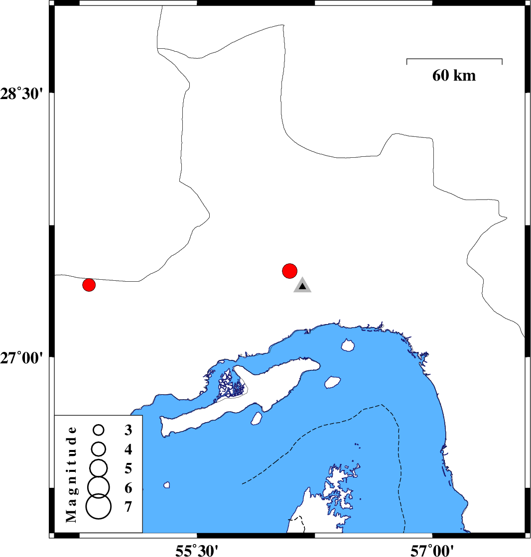 2013/11/20 | 08:20:19.3 | 11:50:19.3 | 27.49 | 56.09 | 15 | ML:4.3 | Hormozgan Province, 39 km North-West of Bandar-e abbas | ||